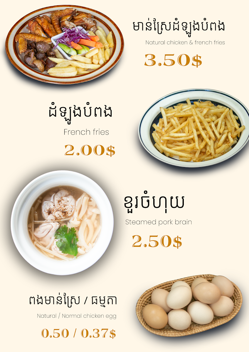 - Culinary Offerings: The menu showcases local Cambodian fare, artfully prepared with a modern twist, alongside comforting options like crispy French fries.